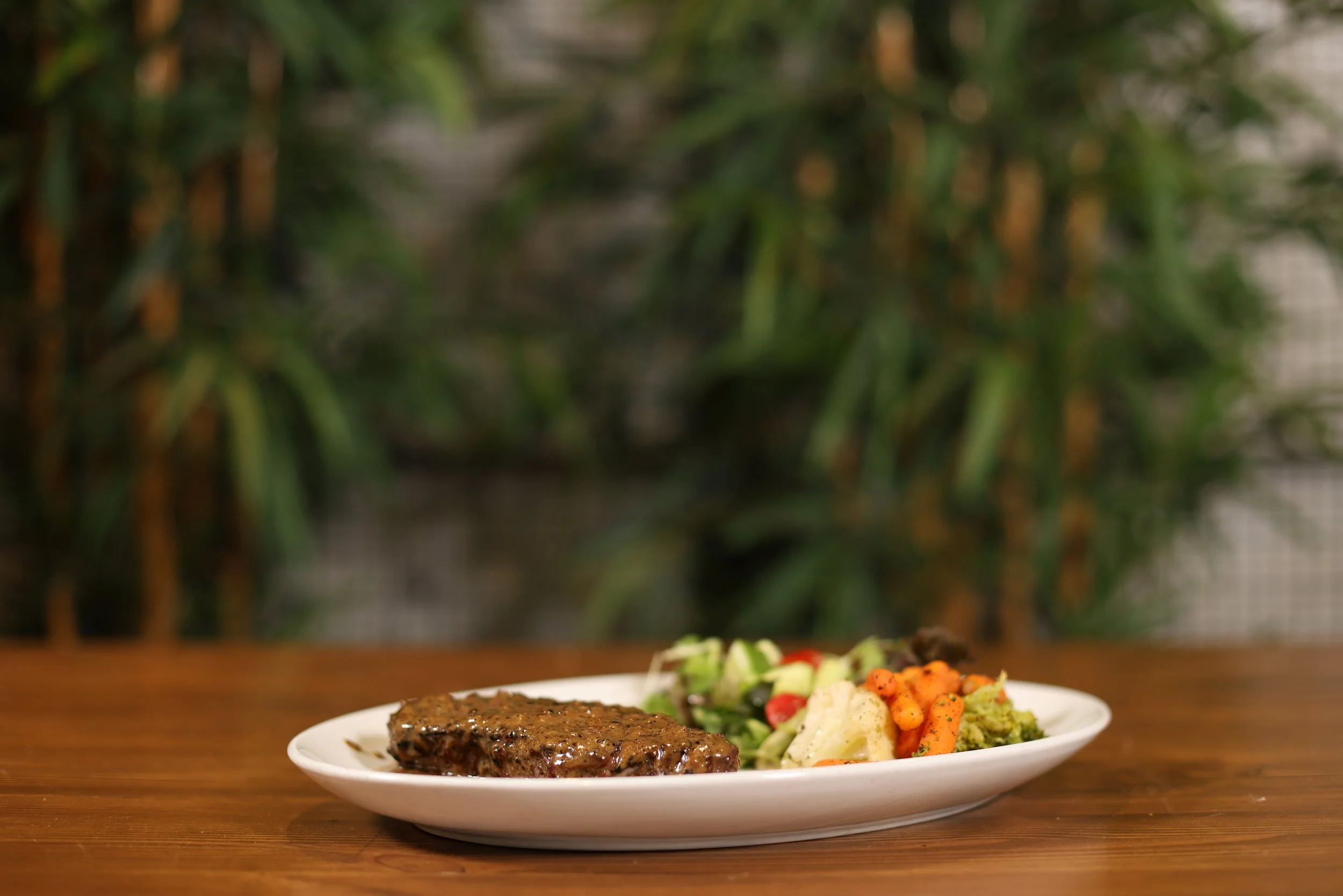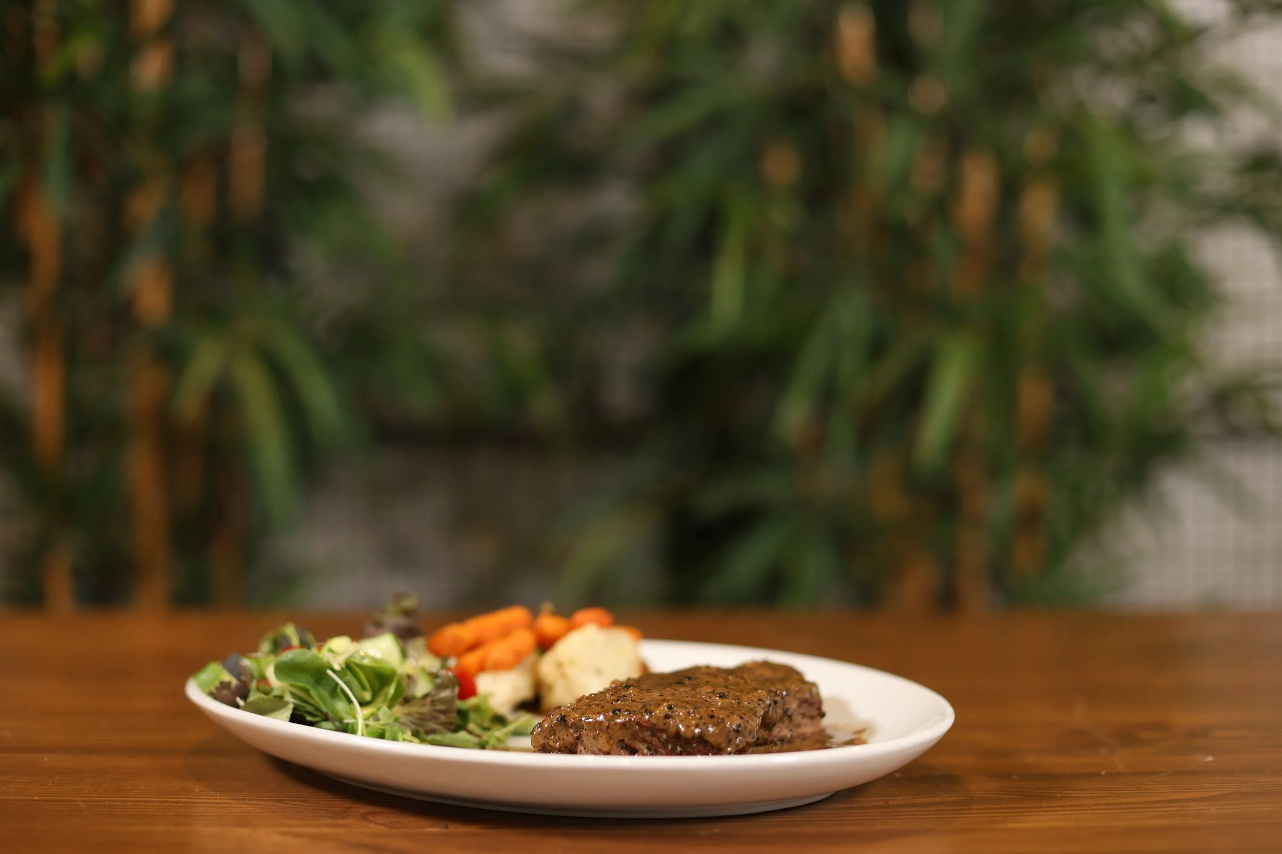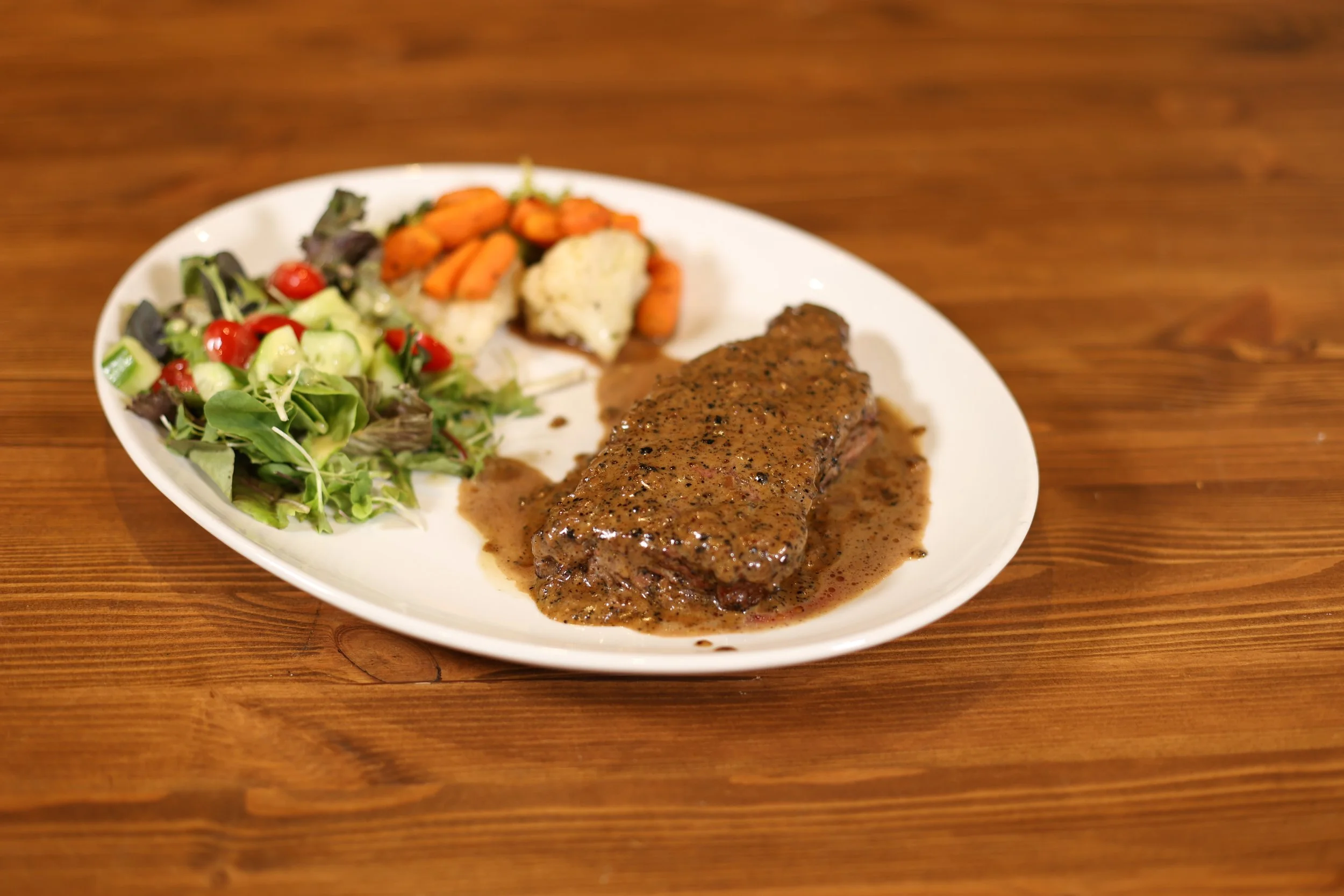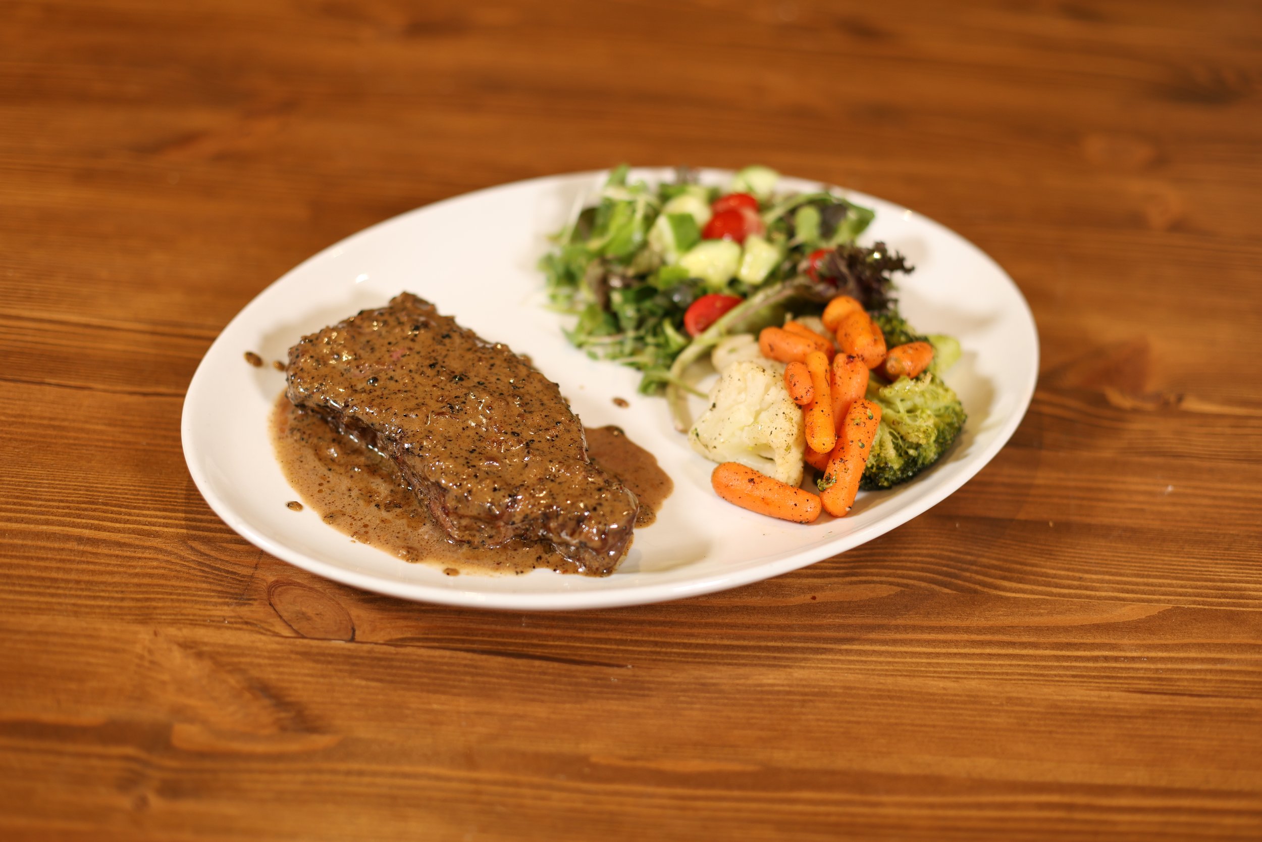 με πλούσια σάλτσα πιπεριού, συνοδευόμενο από λαχανικά και πουρέ πατάτας.